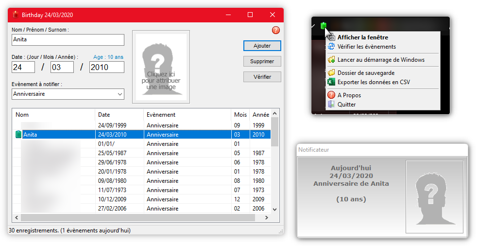 Le logiciel est PORTABLE (Il ne requière pas d'installation, et peut être exécuté à partir d'une clef Usb), la configuration s'inscrit dans le dossier du fichier birthday.Exe
